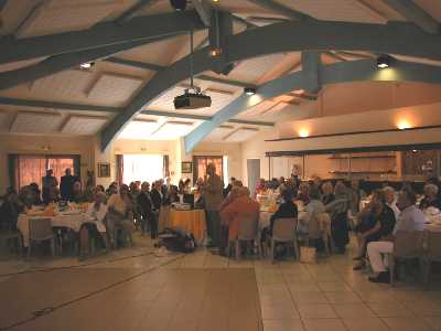 ------Le vendredi soir un premier dîner avait réuni les précurseurs et le samedi matin Bernard avait prévu une visite de Biarritz au "Rocher de la Vierge" et à la "Chambre d'Amour" et une visite inopinée de la ville par le petit train touristique. ------L'après midi un concours de boules avait été organisé avant la réunion "plénière" dans la salle à manger où Bernard adressa, parfois entre deux larmes et trois sanglots, quelques mots de bienvenue aux participants et à leurs conjoints qui n'étaient pas tous originaires de l'autre coté de la Méditerranée, d'Air de France, de Bouzaréah ou de Dély-Ibrahim autrement dit de "chez nous" (il y avait même quelques Oranais égarés !). Il rappela les noms des anciens qui nous ont quitté au cours de cette année et a rendu un hommage aux deux doyennes de notre assemblée, que leur grand âge n'avaient pas empêché d'assister à notre réunion, entourées de quelques uns de leurs enfants : Madame Marcelle Goujon née Bachelier (91 ans) et Madame Bernardine Dehmous (82 ans) Par une manipulation technique de haut vol (normal pour un ancien de l'Armée de l'Air), Bernard a pu établir une communication téléphonique avec deux absents qui avaient regretté de ne pouvoir se joindre à nous, Monsieur Tillot, le pharmacien d'Air de France et Élisabeth Masserini, et toute l'assemblée put entendre avec beaucoup d'émotion (n'est-ce pas Elvire ?) leurs messages en "direct live" amplifiés par la sono. Fut ensuite présenté le tout nouveau blason d'Air de France spécialement conçu et réalisé par Théo Bruand à partir des éléments historiques et géographiques fournis par Francis Rambert qui expliqua la symbolique des éléments figurant sur ce blason. Arlette Schneider de Dély-Ibrahim présenta ensuite "les collines de l'espoir" le livre qu'elle a écrit sur l'histoire de son village et qui paraîtra mi-juin