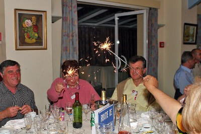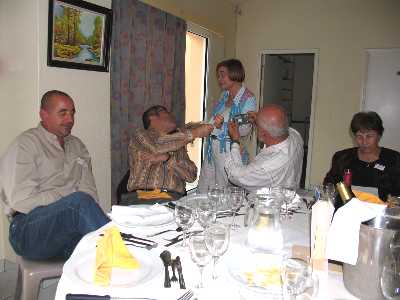 | A l'apéritif (sangria), Marcelle Bachelier-Goujon, Christiane Goujon-Blanco et Hélène Goujon, sont encore calmes mais ça ne va pas durer... | Hélène et Charles Goujon, Arlette Schneider et Viviane Détrez-Zimini fraternisent | ||||||