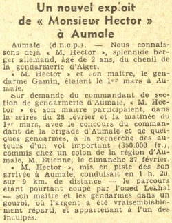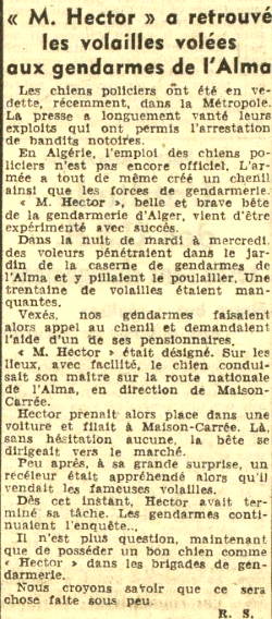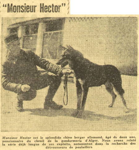 Hector Monsieur Hector est le splendide chien berger allemand âgé de deux ans, pensionnaire du chenil de la gendarmerie d'Alger. Nous avons relaté la. série, déjà longue de ses exploits, notamment dans la recherche des détrousseurs de poulaillers . |
