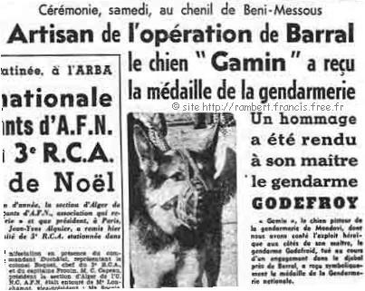 | Article du 29 décembre 1958, relatant la cérémonie qui s'était déroulée au Chenil de la Gendarmerie de Béni Messous le samedi 27 décembre 1958, au cours de laquelle le chien "Gamin" avait reçu la médaille de la Gendarmerie. |
