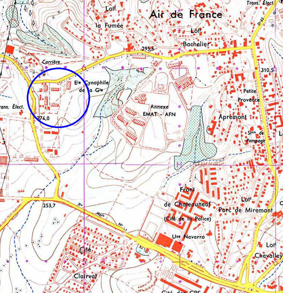 Beaucoup des élèves ayant fréquenté autour de 1950 l'école mixte d'application d'Air de France ont connu ce chenil où le maître, Mr Détrez, nous emmenait à l'occasion en promenade pour l'après-midi. Grâce à ses relations privilégiées avec l'adjudant de gendarmerie qui avait la charge de l'hébergement et de l'apprentissage des chiens "policiers" de la Gendarmerie Nationale, nous avions, une ou deux fois par ans, le privilège d'assister à une démonstration d'exercices de ces bergers allemands : parcours d'obstacle, recherche de pistes, simulation d'attaques du maître-chien par un collègue déguisé en malandrin mais protégé par un caparaçon d'épais tissu matelassé dans lequel les canines du molosse laissaient des traces visibles. Inutile de dire la forte impression que laissaient, aux bambins que nous étions, ces spectacles, à une époque où les représentants de la force publique étaient considérés par tous avec un respect mêlé de crainte. |
