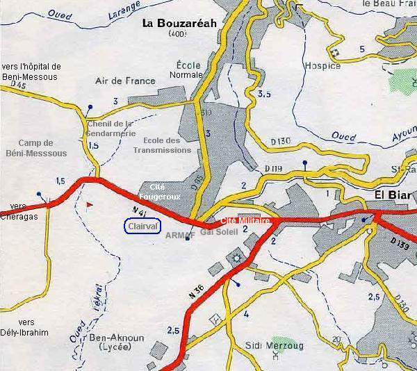 | Le Lotissement Clairval (localisé approximativement sur la carte ci-dessous) faisait il partie d'Air de France ? Ou devait-il être rattaché géographiquement à El-Biar, Châteauneuf, Ben -Aknoun ou Dély-Ibrahim ? Vaste question... Jamais vraiment posée... Et donc restée sans réponse claire... D'autant que les limites d'Air de France n'ont jamais été précisément définies. Jusqu'à ce qu'un autre quartier en revendique (preuves et documents à l'appui) le rattachement, nous, Aérofranciens, nous l'approprions (en réalité, Clairval était situé sur le territoire de la commune d'El-Biar devenue le 7ème arrondissement du "Grand Alger" regroupant Air de France et Dély Ibrahim). En réalité Clarval faisait partie de la commune d'El-Biar et donc du 7ème arrondissement du "Grand Alger" avec Air de France, Dély Ibrahim et El Biar (mais pas Bouzaréah...). |