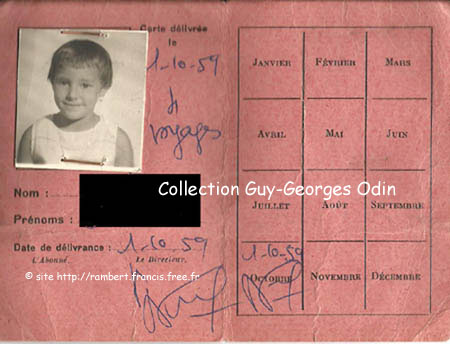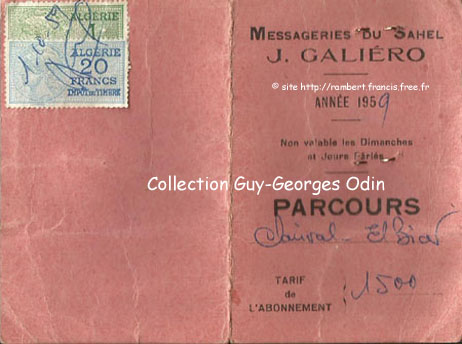 | Recto et verso d'une carte d'abonement sur les Messageries du Sahel J. Galièro valable pour 4 voyages (1500 francs) sur le parcours Clairval - El-Biar en octobre 1959 | |