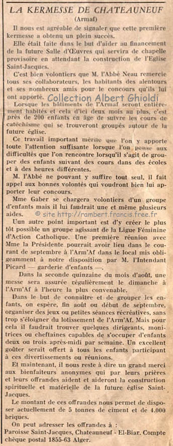 kermesse de l'ARMAF à Châteauneuf en 1957 coupure du bulletin "La Paroisse d'El-Biar" n°91 de juillet 1957 |