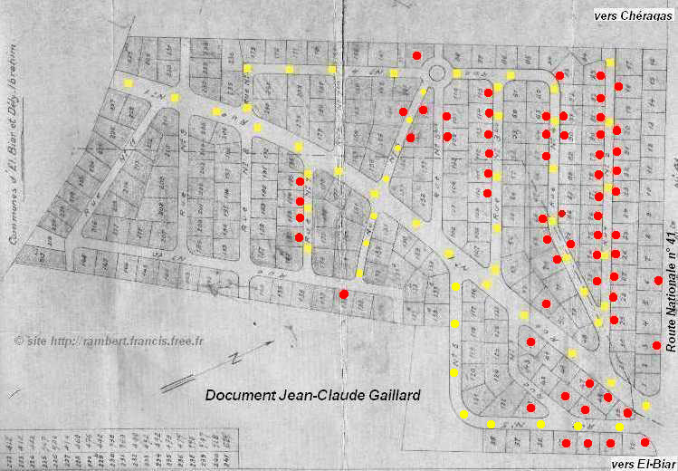 des rues et de lots du lotissement Clairval transmis et renseigné par Jean-Claude Gaillard, avec l'aide de Georges Bondet et de Guy-Georges Odin, complété par Patrick Borrelli (pour la rue d'Oran), Jacques Rippol, Jean Vernat et Gérard Paul Balzan En passant le curseur sur les lots marqués d'un point rouge, vous verrez apparaître le nom des habitants. En passant le curseur sur les rues marquées d'un point jaune, vous verrez apparaître leur nom. |