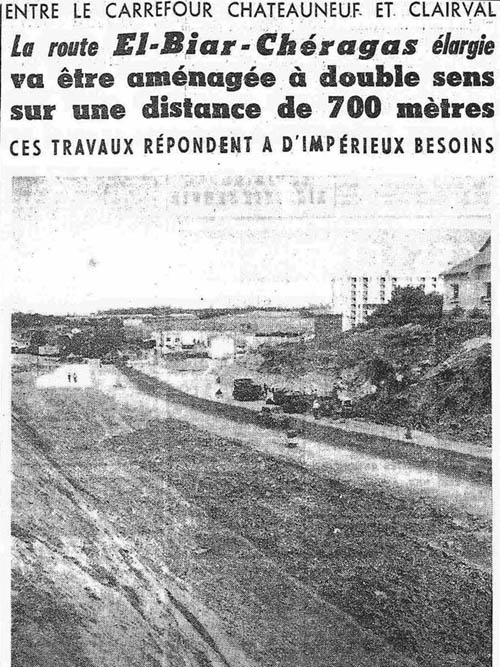 | Au fond à gauche, au-delà des limites de l'École des Transmissions, les villas du Lotissement Clairval situé de l'autre côté de la route (RN 41) venant d'El-Biar (sur la gauche) et menant à Chéragas (sur la droite), |