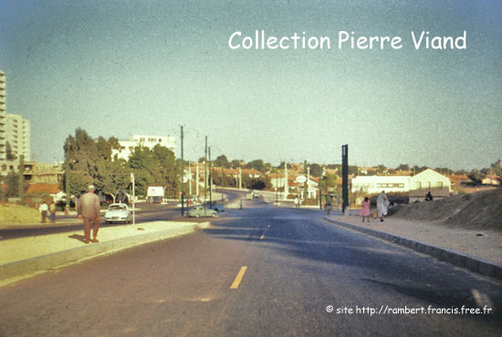 | Débouché de la 2 fois 2 voies provenant de Clairval, au niveau de l'embranchement de Chéragas, en direction d'El Biar. Au fond les villas de la Cité Militaire. A gauche, au niveau du paneau blanc, début de la route du "Frais Vallon" et au niveau des 2 personnages, débouché de la route menant à Air de France et Bouzaréah d'ou provient l'Aronde verte au milie du carrefour | Débouché de la 2 fois 2 voies provenant de Clairval, au niveau de l'embranchement de Chéragas, en direction d'El Biar. Au fond les villas de la Cité Militaire. A gauche, l'immeuble du "Gai Soleil" et au niveau du paneau blanc devant le panneau "Esso", début de la route du "Frais Vallon". En bas à gauche, la camionette militaire Renault arrive de la route menant à Air de France et Bouzaréah |