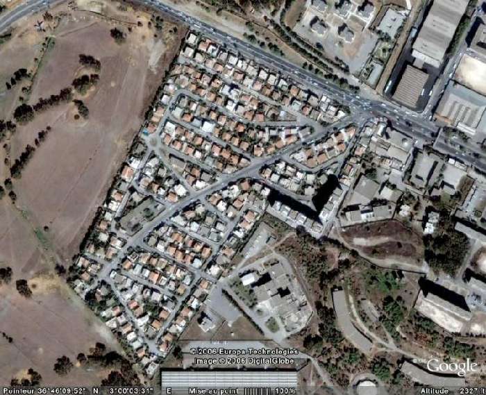 | Malgré la définition médiocre due à l'éloignement de l'objectif, cet agrandissement d'une partie de la photo précédente permet de se rendre compte de l'implantation des villas du Lotissement Clairval, au-delà des arbres longeant la route (RN 41) El-Biar -Chéragas. |