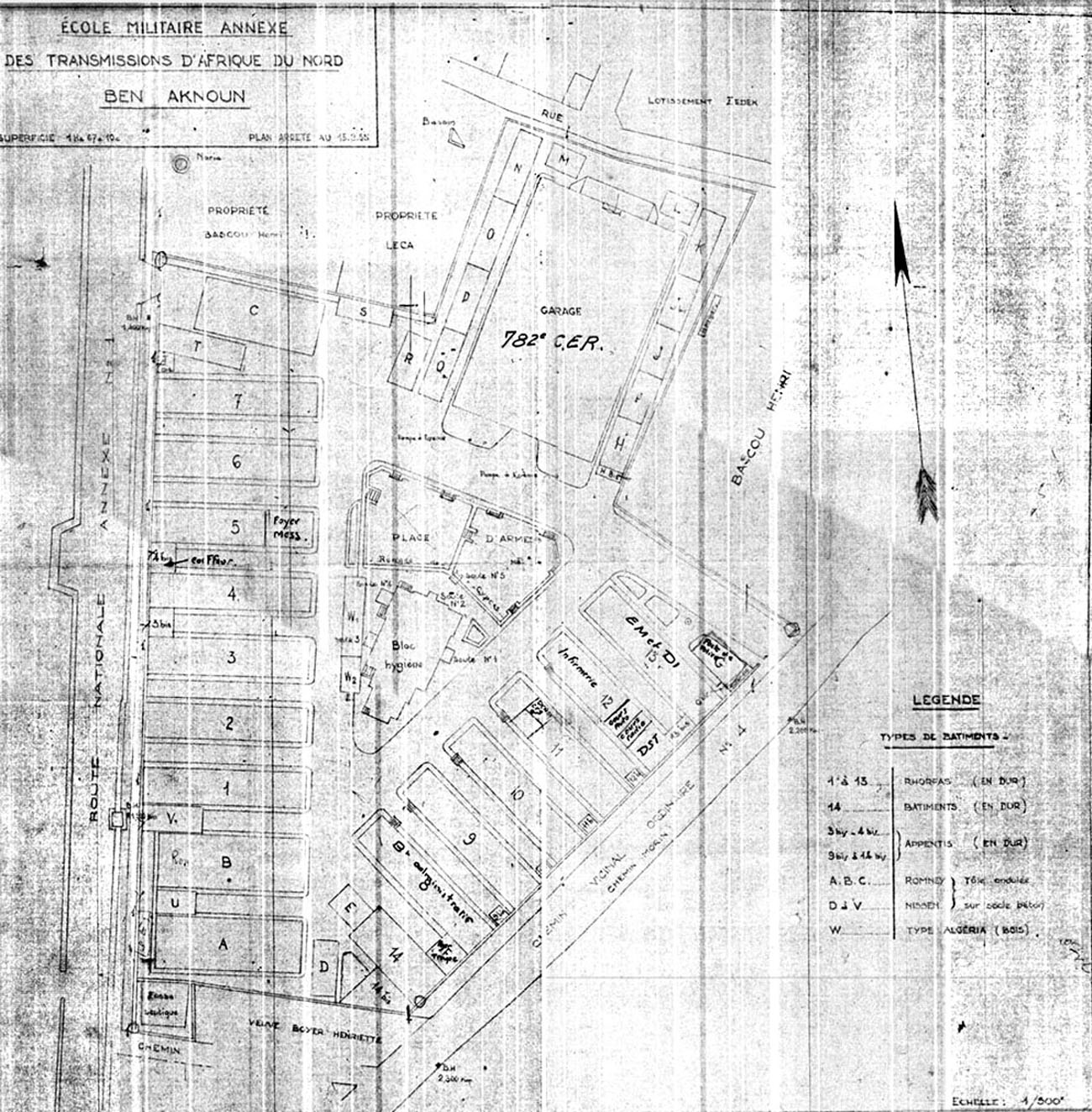 | Plan de l'EMAT AFN à Ben Aknoun, réalisé le 15 septembre 1955 (l'échelle au 1/500 indiquée sur l'original ne peut être appliquée à cette réduction) |