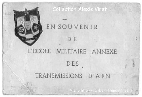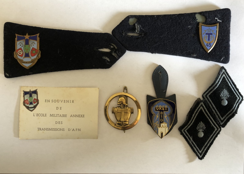 Quelques souvenirs des diverses unités des Transmissions auxquelles a appartenu Jacques Lombard en Algérie en haut :- sur l'épaulette de gauche insigne de l'EMAT/AFN à Air de France, - sur l'épaulette de droite insigne du 45ème Régiment de Transmissions de Maison-Carrée, au dessous,de gauche à droite : - carte souvenir de l'EMAT/AFN, - insigne de béret de l'Arme des Transmissions, toujours utilisé de nos jours, - insigne du GRET 810 (810ème Groupe Régional d'Exploitation des Transmissions) stationné au central militaire "Mogador" (central militaire) au QG de la Xème région militaire, au dessous du Gouvernement Général - et deux insignes de manche en losange du personnel en écoles dont l'EMAT/AFN (absence de numéro de corps, remplacé par une grenade) |