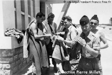 | Devant le batiment dortoir : au premier plan, Nicoletti avec le calot de "marsouin", (il avait un talent incroyable pour le dessin de caricature) et, au centre avec le sourire, Marty. | Dans l'enceinte du camp qui était une friche, Pierre Millet (au centre tête nue) au cours d'un exercice de trans. avec la célèbre Gégène. |