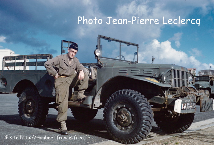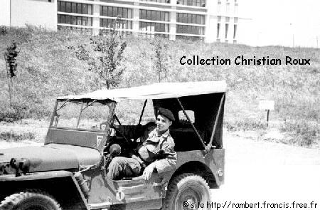 | En 1962, Christian Roux sur la terrasse du bâtiment A (ou T1) qui abritait le peloton sous-officiers au rez de chaussée et le peloton EOR à l'étage. Juste derrière, au 2ème plan le bâtiment "Restauration". Au fond, à droite, le bâtiment "Technique" qui renfermait beaucoup de matériel radio, pour la formation pratique, et aussi l'émetteur de secours de Radio-France. Il y avait plusieurs pylones et antennes sur la terrasse. Au fond à gauche le bâtiment "Instruction" mis en service seulement en 1961 | ... au volant d'une jeep de l'EMAT/AFN... |