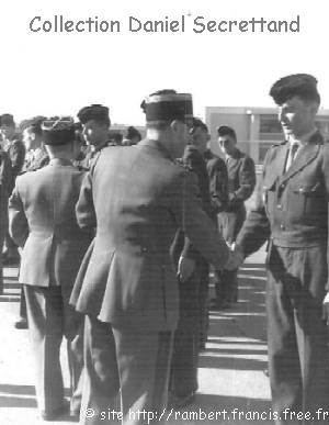 | Le 18 février 1959, le colonel serre la main de Daniel Secrettand qui vient d'être nommé sous-lieutenant |