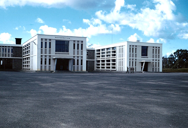 | Le bloc "Restauration" | En 1961-1962, l'aile du bâtiment restauration, située le plus près du bâtiment A ou T1 de la troupe, hébergeait le mess, réservé aux sous-officiers. (Christian Roux) |