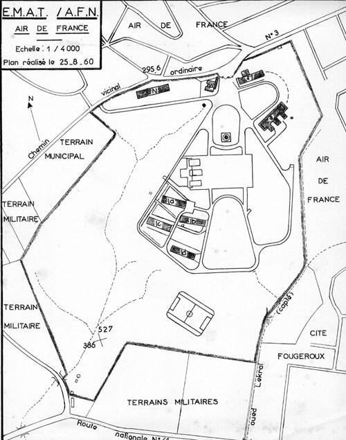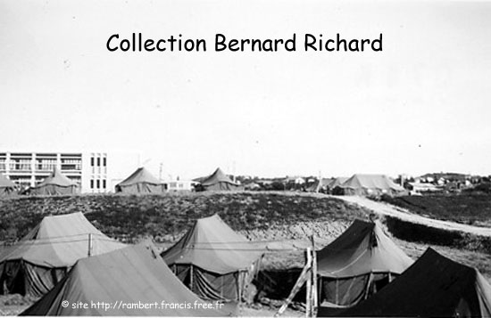 pérennité de ces installations "provisoires". Le 22 février 1962, 900 militaires en tenue camouflée, commandos de la Coloniale avec 28 camions et des jeeps ont installé leur campement sur le terrain de l'EMAT dans des tentes toujours prêtes sur place pour accueillir les bataillons en stationnement. Ce qui confirme "une certaine pérennité de ces installations provisoires", et qui n'exclut pas que d'autres tentes aient été installées pour une situation exceptionnelle. (Christian Roux) |