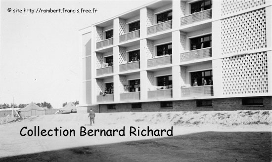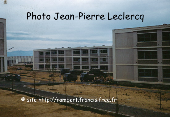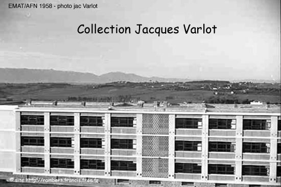 | Encore une vue d'un des bâtiments "Troupe" | Un des bâtiments, probablement T1 (ou A) ou T2 (ou B) de l'EMAT/AFN. La présence de grands tentes, à gauche laisse supposer que tous les bâtiments (T3 ou C et T4 ou D, livrés en 1960) n'avaient pas encore été achevés et qu'il avait été nécessaire d'établir ce campement pour pour héberger certaines activités (à confirmer). Dans le bâtiment A ou T1 étaient hébergés le peloton sous-officiers au rez de chaussée et le peloton EOR à l'étage. Au sous-sol il y avait quelques petites salles de formation pratique (manipulation des armes entre autres) avec un accès en forme de labyrinthe pour, paraît-il, résister en cas de souffle d'une bombe nucléaire |