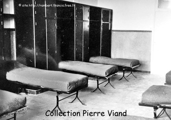 avait une buanderie-lavoir pour les stagiaires. (Théo Bruand) Le bâtiment B ou T2 abritait l'Infirmerie. C'est là qu'un médecin officier (commandant ou capitaine) m'a fait passer la première visite médicale. Il y avait aussi un médecin aspirant. Les vaccins étaient faits dans ce bâtiment. Il y avait au moins un infirmier et un chauffeur avec un véhicule sanitaire pour emmener les consultants à l'hôpital Maillot. Il y avait au moins une chambre, voire plusieurs, pour y soigner les malades. Je ne sais si l'infirmerie prévue devait occuper tout le bâtiment. L'infirmerie que j'ai connue occupait la partie de rez de chaussée du bâtiment B situé près de l'entrée. Le médecin avait son bureau sur la gauche du couloir. Les vaccins se faisaient dans une pièce située en entrant à droite. (Christian Roux) |