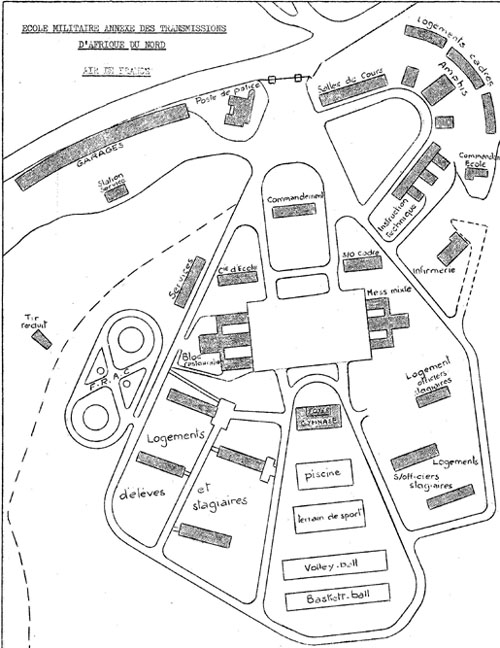 L'affectation des bâtiments en janvier 1962 était la suivante. Bâtiment A ou T1: 1er GI (Groupe d'instruction) Peloton d'élèves sous officiers d'active PESOA, RDC et 1er étage, peloton d'élèves officiers de réserve EOR 2ème étage. Bâtiment B ou T2 : 3ème GI, Peloton de stagiaires appelés et en partie l'infirmerie (le médecin aspirant appelé devait s'appeler Cuvellier). Bâtiment C ou T3 : 2ème GI, Peloton de sous-officiers en formation pour des spécialités transmissions, salle de cours et peut-être logements pour les sous-officiers de passage en formation. Bâtiment D ou T4 : 4ème GI, PFAT et commandement EMAT, compagnie de services ?, fourrier. (Christian Roux) Le quatrième bâtiment était celui de la Compagnie d'École et des services administratifs. (Pierre Vantalon) |