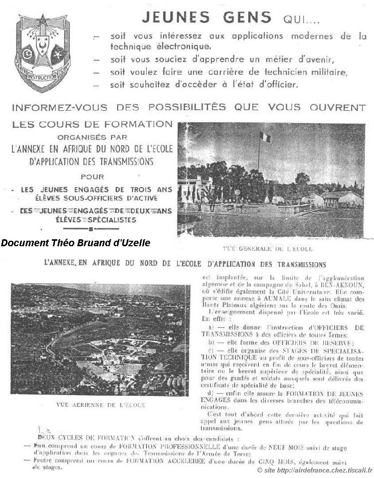 Engagez vous ! Théo Bruand d'Uzelle nous a fait parvenir ces publicités pour l'École Militaire Annexe des Transmissions d'Afrique du Nord alors qu'elle était encore implantée à Ben-Aknoun et Aumale avant qu'elle ne s'installe dans les bâtiments nouvellement construits à Air de France