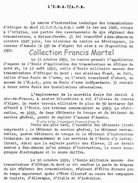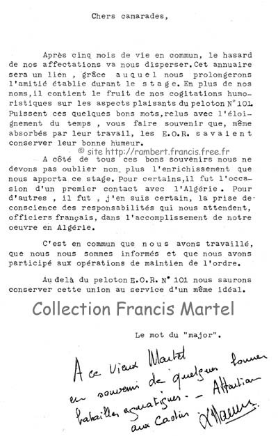 Francis MARTEL nous a transmis ce document sur le Peloton EOR 101 de l'EMAT/AFN (septembre 1960 - février 1961) Historique de l'EMAT/AFN - Le "mot du major" Xavier NAMY