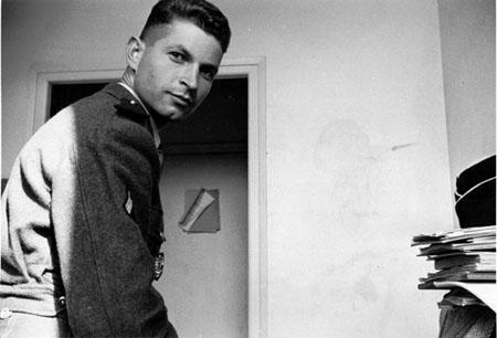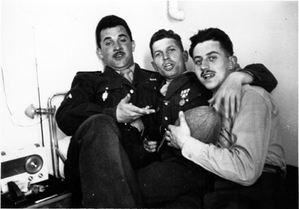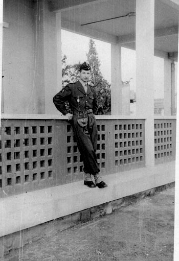 | Jean Braun dans le bâtiment T2 en 1956 | En 1956 dans le bâtiment T2, sergent Dominique Pain (18ème PESOA?), Jean Braun et François Thézé |