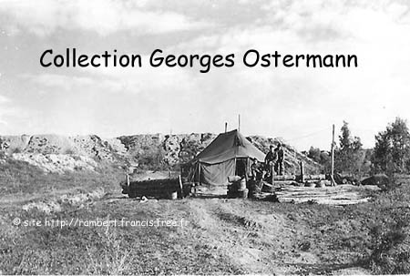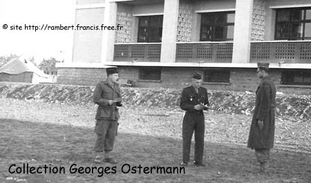 Holle, le sergent Gatt (?) et Georges Ostermann au rapport On suppose que ce n'était pas pour des félicitations !. Le beau casernement était tout neuf mais on marchait dans la gadoue. Les tentes abritaient des appelés dans un confort qui n'améliorait pas les relations avec les engagés |