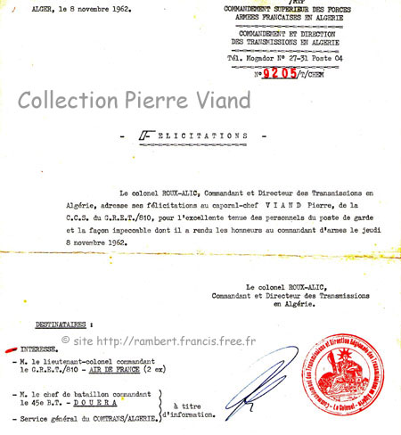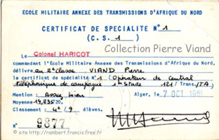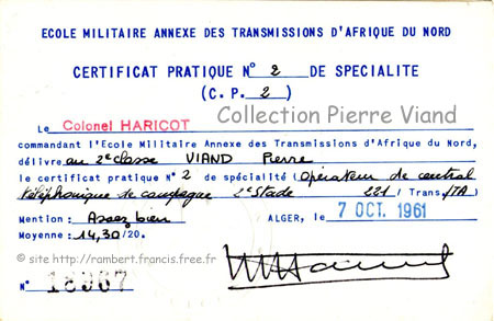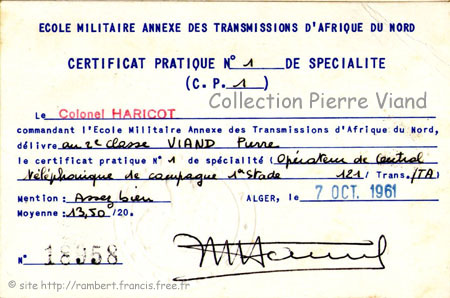 et une affectation à Ben Aknoun. Début juillet, nous fûmes embarqués sur le "Ville de Marseille" (horreur due au mal de mer) et conduits à Air de France où j'effectuai mes classes. Étant le plus "diplômé" des bleus (à cette époque, le niveau bac faisait encore référence) je fus repéré et l'on me fit suivre une formation qui me vit titulaire des certificats CS et CP 1 et 2). Puis il fut acquis, après une batterie de tests et d'entretiens, que je pourrais suivre la formation EOR. Malheureusement, il y avait à Ben Aknoun, l'état major du sous-secteur de la Bouzaréah composé d'une dizaine de personnes dont 3 appelés. L'un étant libérable, il fallait le remplacer. C'est moi qui fus désigné. Déception, mais on ne discute pas ! Mes activités furent donc variées, alternant patrouilles, crapahut dans la forêt de Baïnem, garde, distribution de courriers urgents aux quartiers placés sous l'autorité du SS/BZH (El-Biar, St Eugène, entre autres), intervention avec la section d'alerte en cas de problème sur notre secteur ; mais aussi travail administratif pour les 5 bureaux (de mémoire : 1er B. Administration de l'armée, 2ème B. renseignements, 3ème B. opérations de "maintien de l'ordre", 4ème B. Formation, 5ème B. Action psychologique), répartition du courrier en provenance de la Zone Alger-Sahel, frappe du courrier départ, envoi et diffusion des télex. Bref, pas de quoi s'ennuyer avec le Colonel Haricot. En outre, à l'entrainement au tir, face à la mer, j'eus la bonne idée de me retrouver tireur d'élite et à ce titre d'étalonner tous les MAS 36 du 12ème BI basé dans la caserne. Je rentrais de ces séances de tir complètement sourd de l'oreille droite. Nous utilisions aussi la MAT 49 (qui nous servait en patrouille), mais pas l'AA 52 (seulement à l'entrainement). On s'entrainait aussi à lancer les grenades offensives, utiles en manif pour se dégager. Bref, la vie du bidasse, jusqu'à l'indépendance. Je vécus la nuit bleue à ALGER (100 explosions dans la nuit), en gardant le QG de la Zone Alger-Sahel situé sur les quais. L'OAS avait décidé une opération terre brûlée avant de partir. Angoisse ! À cette époque, le gendarme Guillemot faisant office d'OPJ (je crois) auquel nous ramenions les interpellés, ainsi que le capitaine du 2ème B furent l'objet de tirs en sortant de leur domicile. Ils en réchappèrent et il fut décidé de nous rapatrier à Air de France.Le Lieutenant-colonel Armand PARISON me prit comme secrétaire, compte tenu de ma petite expérience acquise à Ben Aknoun. Nous fûmes rattachés, pour raison administrative, au GRET 810, visible sur mon manteau de Sergent. J'avais peu de travail, aussi me demanda-t-il de lui acheter un appareil photo et d'en réaliser de la région. Me voila bombardé photographe avec, comme chauffeur, un nouvel appelé qui était un copain de classe à l'ENP (École Nationale Professionnelle) de Paris-Raspail que je n'avais jamais revu. Il était également grand amateur de photos et avait un labo.