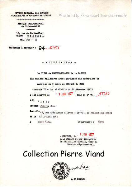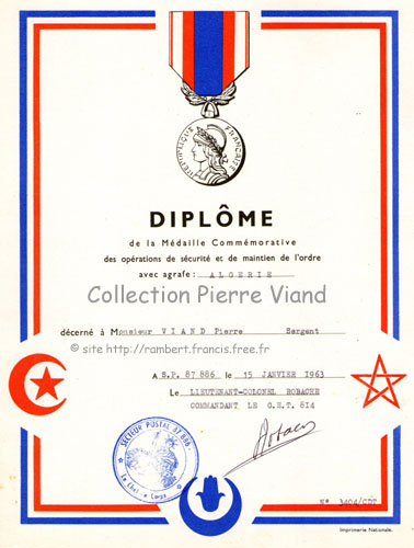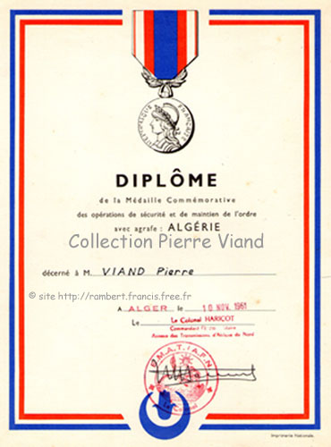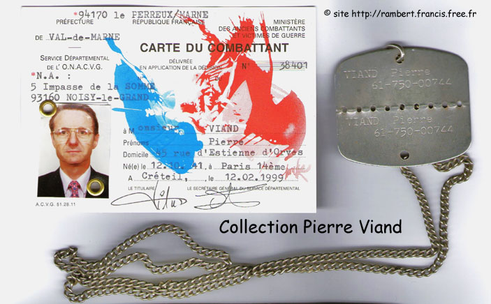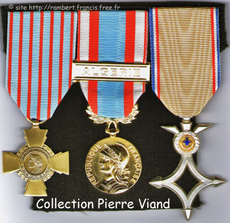 | Décorations de Pierre Viand : Croix du Combattant, Médaille Commémorative des Opérations de Sécurité et de Maintien de lOrdre en AFN, Médaille de Reconnaissance de la Nation en AFN | Carte du Combattant et plaque d'identité |