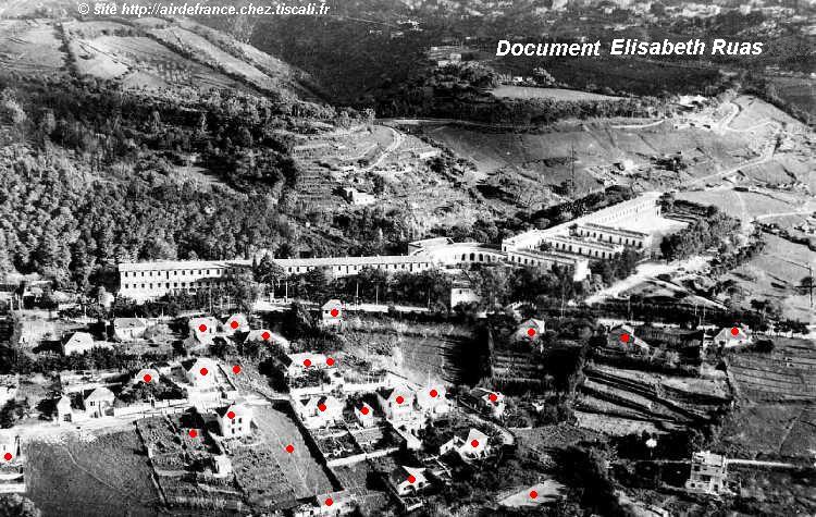 | En face de l'École Normale d'Instituteurs, le Lotissement Pignodel était situé sur le côté gauche de la route montant à Bouzaréah, entre le café Sandra et les "Deux Piliers". Jacques Henri Jayez ("Rijac") nous a confié ses souvenirs de l'époque et, sur cette photo datant d'avant 1950, que nous a adressé Elisabeth ("Babeth") Bourdères-Ruas, il a essayé d'indiquer les noms des habitants de ce lotissement, dont il se souvenait (vous pourrez voir apparaître ces noms en passant le curseur sur les points rouges situés près des maisons). Hors cadre et donc ne figurant pas sur ce cliché, le café Sandra qui se trouvait plus bas sur la route de Bouzaréah (donc sur la droite de la photo) et les demeures des Ayache, des Kechteil et des Llorens qui se trouvaient plus haut (donc sur la gauche de la photo), près des "Deux Piliers". |