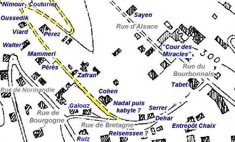 | Grâce à la mémoire et aux souvenirs de quelques anciens habitants d'Air de France, nous avons pu localiser un certain nombre de rues qui avaient été baptisées de noms des provinces de France. Les noms de ces rues ont ainsi pu être placés sur le plan d'Air de France en 1958 que Théo Bruand a reconstitué. Théo, que nous remercions vivement, nous a donné l'autorisation de reproduire ce plan et de le placer sur le site. Sur la partie de ce plan ci-dessous, focalisée sur la rue d'Auvergne, j'ai tenté de placer, selon les indications de Narriman et Leila,, les noms de ses habitants dans les années 1947-1962. Il est possible qu'il y ait des erreurs ou des oublis. Merci par avance de me les signaler afin qu'ils soient corrigés. |