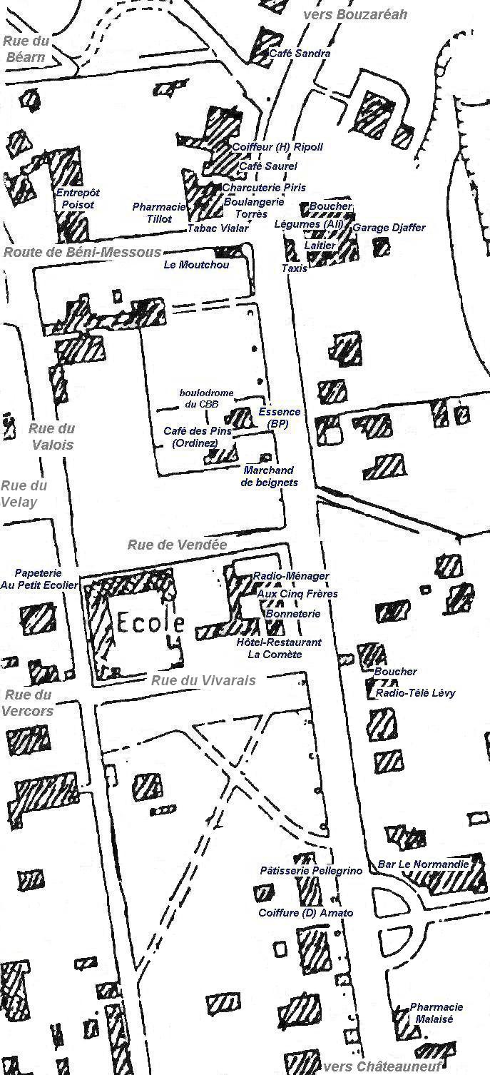 chacun pour nous signaler les erreurs et les oublis. Nous devons à Mohamed Abrous la photo récente du marchand de beignets et de patisseries orientales chez lequel beaucoup d'entre nous allaient dépenser leurs petites pièces en échange de beignets bien dorès et bien gras ou de confiserie pleine de miel... Pour voir cette photo, trouvez sa localisation sur le plan et cliquez dessus |