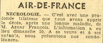 du décès de François Aznar (oncle de Guy) Echo d'Alger du 12 avril 1949 |