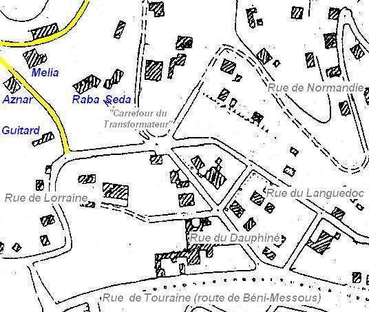 | Grâce à la mémoire et aux souvenirs de quelques anciens habitants d'Air de France, nous avons pu localiser un certain nombre de rues qui avaient été baptisées de noms des provinces de France. Les noms de ces rues ont ainsi pu être placés sur le plan d'Air de France en 1958 que Théo Bruand a reconstitué. Théo, que nous remercions vivement, nous a donné l'autorisation de reproduire ce plan et de le placer sur le site. La partie de ce plan ci-dessous, est focalisée sur la rue du Loiret. Guy Aznar nous a fourni quelques renseignements sur les noms de ses habitants dans les années 1947-1962. Nous faisons appel à la mémoire de chacun pour compléter la documentation de ce plan. |