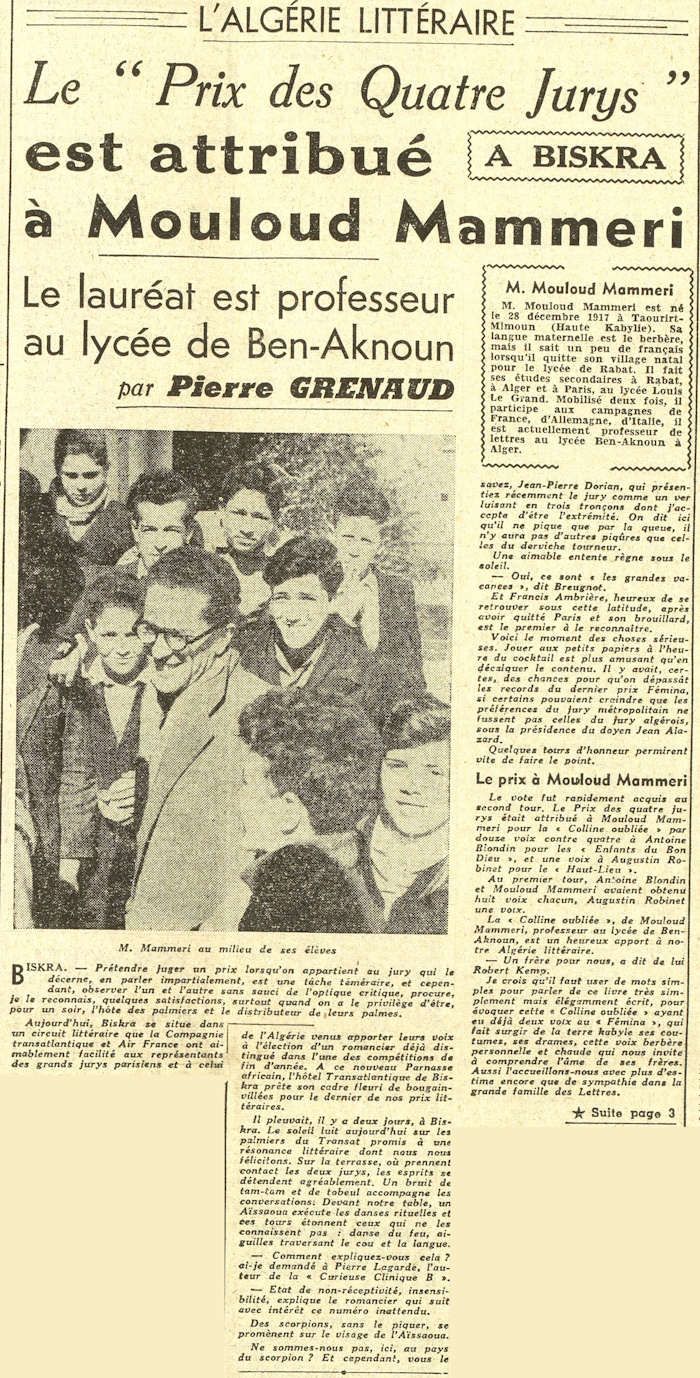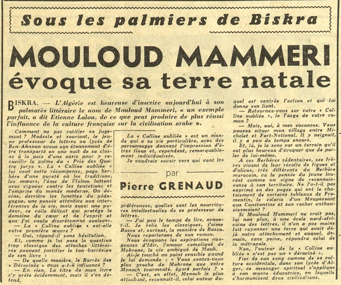 était attribué à Mouloud Mammeri pour la « Colline