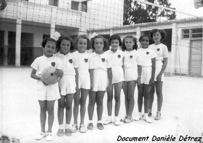 1952, les benjamines du C.A.F., dans la cour de l'école. De gauche à droite (sauf erreur) : Francine Tabet (tenant le ballon), Leïla Oussedik, Viviane Détrez, Lydia Pérez, X, Claude Élie, Marceline Tabet, Nadra Oussedik. |