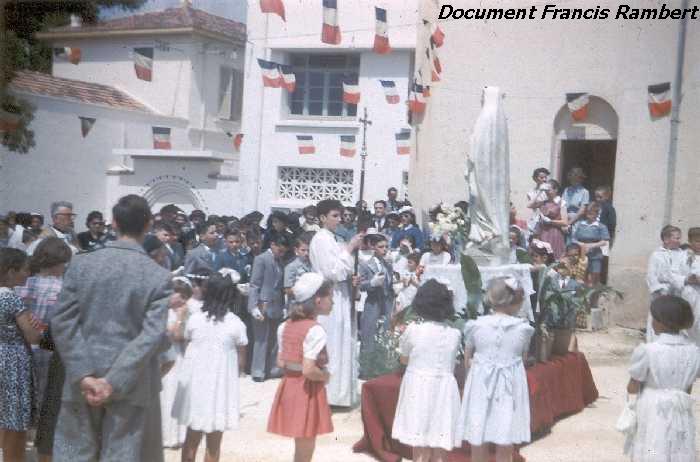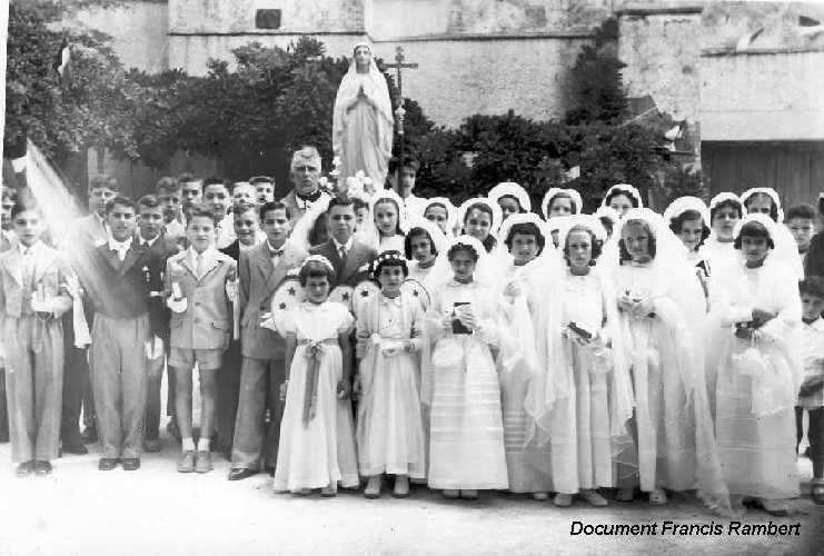 La cérémonie de la Communion Solennelle avait eu lieu le matin dans l'église Saint-Louis de Bouzaréah. L'après-midi, les communiants et communiantes se retrouvaient pour les Vêpres qui se déroulaient en plein air (nous étions en Algérie, au mois de juin 1953 et le beau temps le permettait !) |