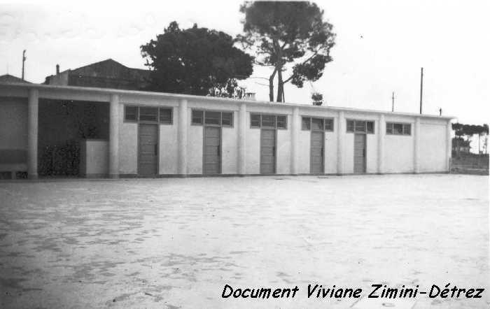 Cette vue de l'autre coté de la cour, est prise depuis la galerie abritant les salles de classe. Tout à gauche,on distingue un bout des lavabos, puis les toilettes "garçons" (les toilettes "filles", encore plus à gauche n'apparaissent pas sur ce cliché). Les locaux suivants sont affectés aux douches ainsi qu'à une remise pour le bois de chauffage pour les poêles (dont je ne me souviens pas que nous nous soyons jamais servi). A l'extrême droite, les pins longent la route de Bouzaréah. |