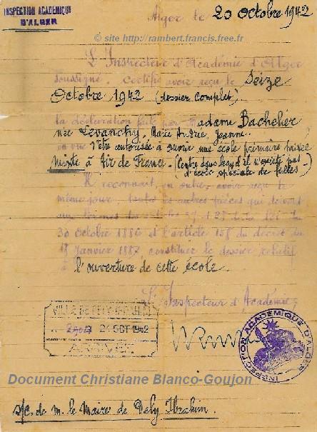 | Nous remercions Christiane BLANCO née GOUJON qui a bien voulu nous confier la copie de ce précieux document, retrouvé dans les archives familiales, autorisant sa grand-mère Marie BACHELIER à ouvrir une école primaire privée mixte à Air de France. |