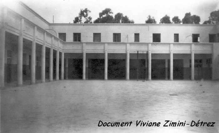 Cette vue est prise depuis la cour de récréation. A gauche, au rez-de-chaussée, sous la galerie, les quatre salles de classe. Au fond, l'aile du bâtiment est occupée, au rez-de-chaussée par le préau ainsi que par l'entrée de l'école et, au premier étage, l'appartement d'un instituteur, Monsieur Astier. Les deux traits noirs sont les poteaux qui recevront les panneaux supportant les paniers pour le basket. |