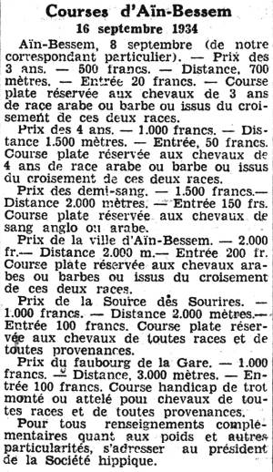 | "L'élevage du cheval y est pratiqué avec succès ; deux fois par an, un comité de primes et d'achats, vient nous visiter ; également tous les ans au printemps, un détachement de remonte, commandé par un sous-officier et monté de dix beaux étalons, séjourne environ deux mois pour la saillie, à la grande satisfaction des éleveurs européens et indigènes" | |