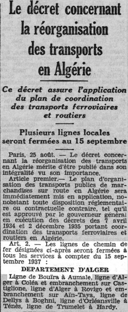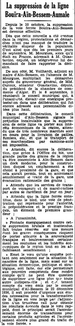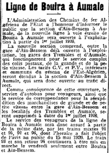 de fermeture de la gare d'Aumale à partir du 15 septembre 1935 (Écho d'Alger du 26 août 1937) |