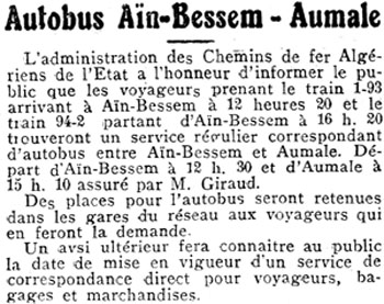 | En attendant l'ouverture complète de la ligne, les C.F.A avaient mis en place un service de correspondance par autobus pour Aumale à partir d'Aïn Bessem (Écho d'Alger du 11 juin 1925) | Horaires des