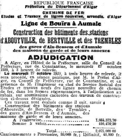 anciennement Est-Algérien). Depuis de longues années, une voie ferrée est à l'étude devant joindre Aumale à Bouira via Ain-Bessem, et se prolonger par la suite dans la direction de Berrouaghia. Anciennement, cette ligne devait être à voie étroite et exploitée par les C.F.R.A., ses premiers travaux en ont été exécutés, et les terrassements et ouvrages d'art amenés jusqu'à quelques kilomètres d'Aumale. Dans le nouveau programme de travaux publics algériens, la ligne doit être à voie large, craignons donc que tout soit à recommencer, et bien que l'on voie de temps en temps sur le parcours des géomètres ou des ingénieurs placer et déplacer des jalons, il est à craindre que l'état de choses actuel ne dure encore longtemps." |