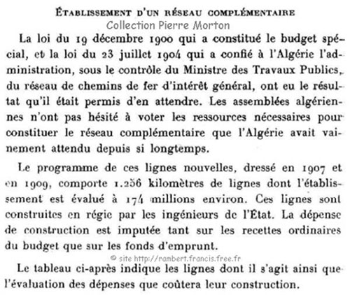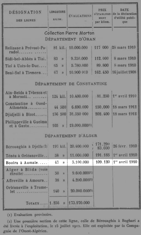 sur le site. "Il est exact que la construction d'une voie ferrée entre Bouira et Aumale a finalement été réalisée mais le train n'y a jamais circulé. Il subsistait quelques viaducs en bon état en 1962 (voir les photos des viaducs). La vue de la gare s'intègre parfaitement dans le quartier. Le service des Ponts et Chaussées en avait récupéré une partie pour y loger son parc à matériel ainsi qu'à Ain-Bessem où la gare abritait logements et bureaux et où le bassin de lavage des locos avait été transformé en piscine (privée) du service." Mais Pierre Morton nous a apporté des précisions et des documents qui indiquent qu'après 1925-26, des trains ont circulé pendant quelque années entre Bouira et Aumale. Cette ligne a été déclarée d'utilité publique le 1er avril 1910. Sa construction était à la charge de la "Colonie" c'est à dire du Gouvernement général de l'Algérie. La guerre de 1914 n'a pas permis que sa construction soit rapidement menée. Documents extraits de l'ouvrage "Les chemins de fer algériens" par Maurice Antoine BERNARD (éditions Adolphe JOURDAN - 1913) |