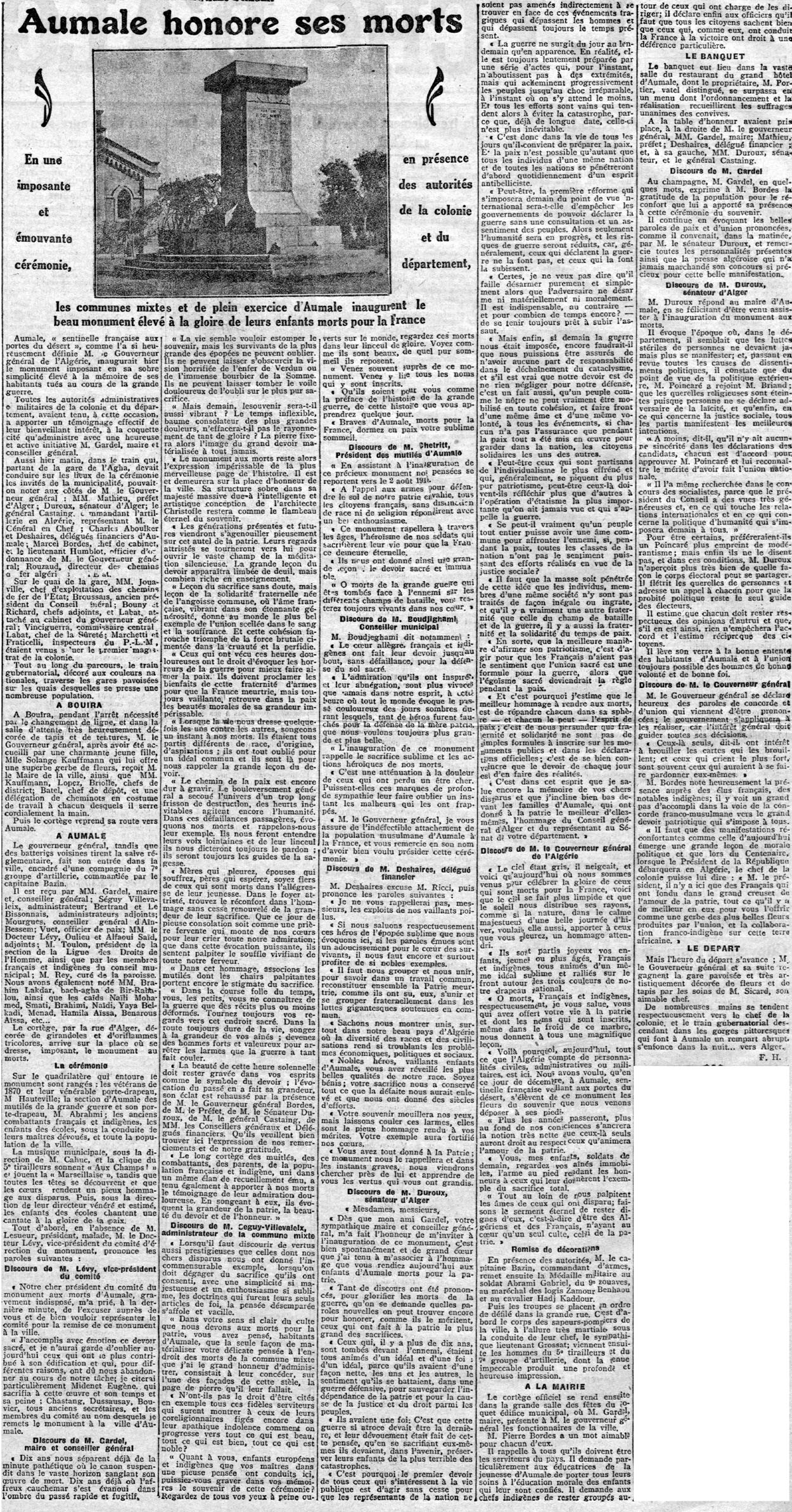 les communes mixtes et de plein exercice d`Aumale inaugurent le beau monument