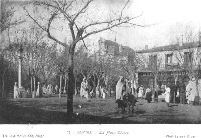 | "Au centre de la ville, la place Thiers avec sa colonne supportant le buste de la République flanqué à droite et à gauche de beaux bâtiments et à l'ouest par le gracieux square Carnot éclairé au gaz entouré d'un socle en maçonnerie surmonté d'une grille et dont le centre est occupé par un bassin en pierres de taille avec jet d'eau." |