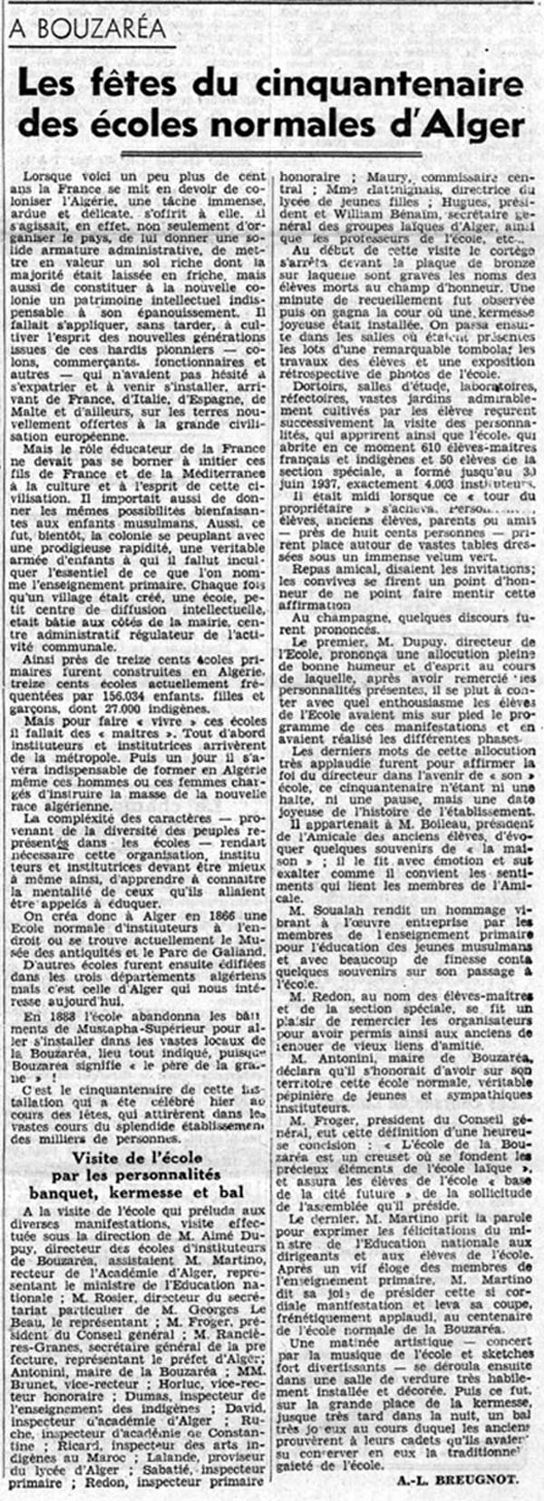 Cinquantenaire des Ecoles Normales d'Alger-Bouzaréa dans l'Echo d'Alger