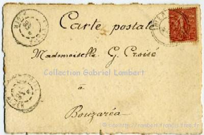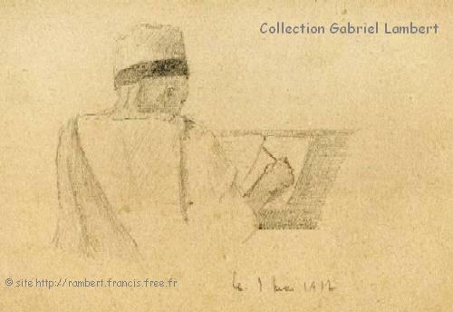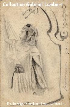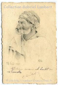 | En 1905, Cassien qui venait de rejoindre son poste d'instituteur à Taka, en Kabylie a desiné ce vieux kabyle et a envoyé ces dessins à Germaine Croisé, sa future épouse, route de l'Observatoire à Bouzaréah. L'adresse au dos de la carte postale (confection artisanale locale "maison" !) représentant le "chibani" est des plus sommaire. |