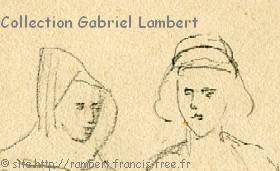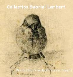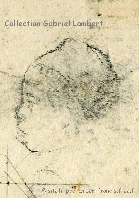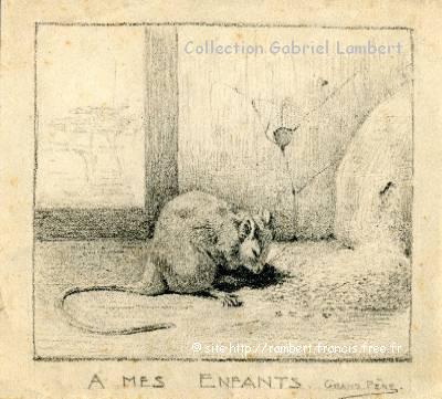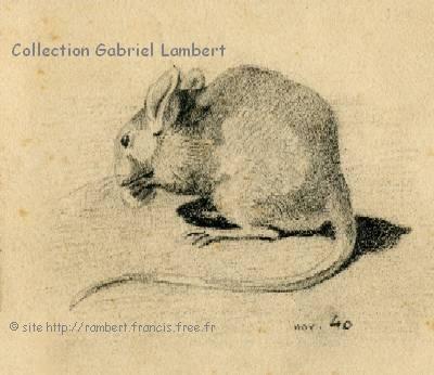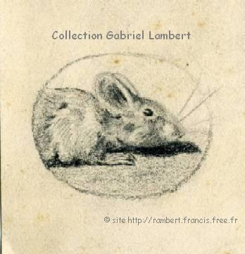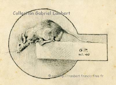 | Quelques autres dessins réalisés par Cassien Lambert (signés GP pour grand-père) en 1940. Le premier dessin (museau de rat dans un cercle) a été agrandi : sa taille réelle est de 2 x 3 cm ! |