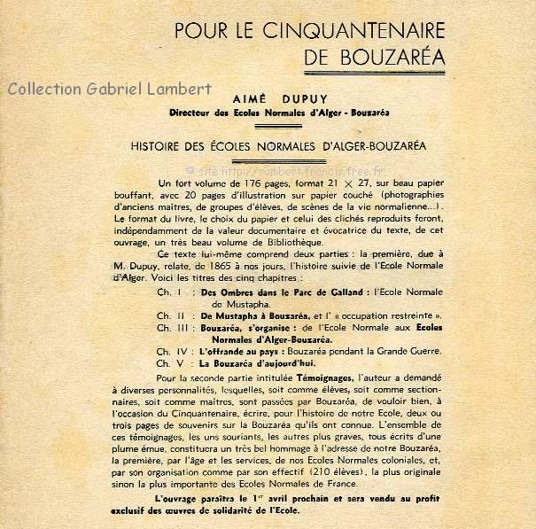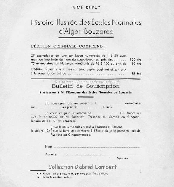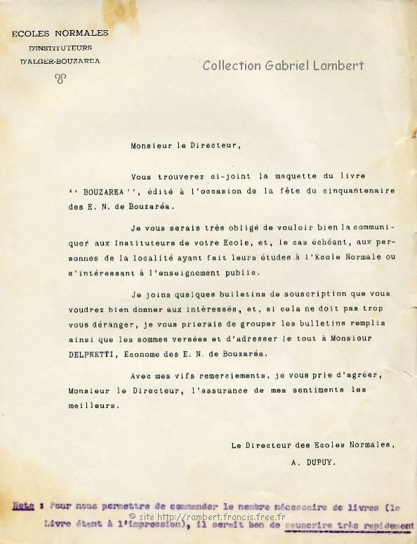 | Courrier du Directeur des Écoles Normales, Mr Aimé DUPUY adressé aux Directeurs des écoles d'Algérie, pour les inviter à souscrire à l'ouvrage qu'il allait publier àl'occasion du Cinquantenaire de l'École Normale de Bouzaréah. Cette lettre est celle que le grand-père de Gabriel Lambert à reçu alors qu'il était à Tizi-Rached en Kabylie. Ce courrier était accompagné de bulletins de souscription (ci-dessous) et de la maquette de l'ouvrage |